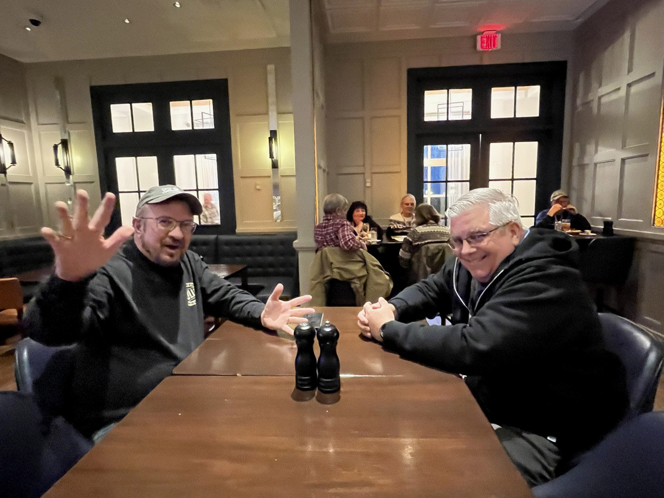 | December 7, 2025 - TRAACA Holiday Party - More than 90 members showed up for our annual Holiday Brunch at the Princess Anne Country Club in Virginia Beach. The weather was very cool but sunny, allowing a great display of antique vehicles parked out in front of the Country Club. Cars included Alfonso and Patrizia Ludovici's 1949 Mercury, Bob Stein's 1949 Nash Ambassador, Scott Davies' 1958 Corvette convertible, Jim and Betty Viller's 1967 Mercedes 230SL, Hilary Pavlidis' 1967 Mercury Cougar, Doug Grosz's 1968 Oldsmobile 98, Wayne Milligan's 1968 Ford LTD, Harry Park's 1970 Chevelle SS convertible, Riley Best's 1971 Plymouth Satellite hardtop, Larry Goughan's 1971 Dodge Charger R/S, Fred Coles's 1988 Toyota Supra, Nick Smith's 1991 Cadillac Fleetwood Brougham, Mickey and Toni McChesney's 1982 Buick Riviera convertible, Joe Formato's 1985 Avanti, Ken and Barbara Talley's 1992 Buick Roadmaster, Boyd Swartz's 1993 940 Turbo Wagon. President Bill Treadwell kicked things off with a few announcements, then Nick Smith provided the blessing, and then it was time to eat! The country club always puts on a spread, and today's brunch included huge cocktail shrimp, prime rib and omelet stations, as well as breakfast fare such as eggs benedict, bacon, cheese grits, and waffles. Following the meal, we tried to match up starting and ending lyrics on stickers provided by Linda Pellerin and Tammy Park, and also worked out crossword puzzles that included such gems as 'What car maker started with a Model A?' (Ford). Many thanks to all for a great event! |