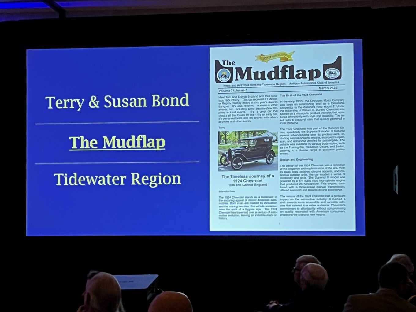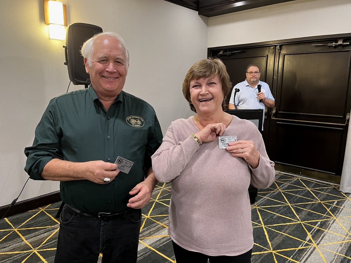 | January 10, 2026 - TRAACA Awards and Installation Banquet - This year's Installation and Awards banquet was held Holiday Inn Convention Center with record-breaking warm temperatures, unlike last year where we had to postpone a few weeks. President Bill Treadwell started off with introductions, and had Nick Smith provide the benediction. Following a buffet dinner, Bill and Vice-President Harry Park presented awards the awards for 2025. Jim and Donna Elliott repeated their win of the Bartlett Bowl, and the Beaulieu Cup was awarded to Rick Seaman for his 1964 Plymouth Barracuda. The Century Award went to Tony Miller and his 1925 Model T Ford and Sam Kern for his 1925 Franklin. The Century participation award again went to Reggie and Cindy Nash. Bob Stein received the Duryea Award, and the Ivie Lister Award went to Tim Hund. Tammy Park received the Lalique Award, while the Merritt Horne Participation Award went to Linda Pellerin. The Mudflap Award went to Aubrey Austin, with the Overland Award going to Jim and Donna Elliott. The Tidewater Region President's Award went to Dan and Chris Ciccone, and Chip Woolford received the Tidewater Region Restoration Award. The Spark Plug Award went to two individuals this year: Jerry Adams and Holly Forester. The Dwight Schaubach Award, which went to Dalton and Carroll Williford for their 1967 Pontiac GTO. Although we didn't give it out last year, this year's Hard Luck Trophy did have a recipient - Skip Patnode. Then Linda Pellerin then took over for the installation of 2026 TRAACA officers. Using borrowed 'props' to illustrate their function, Linda went over each position and its importance to the region. Bill Treadwell (rear view mirror) is the President Emeritus providing the knowledge of where we have been. The four Board Members Skip Patnode, Rick Seaman, Wayne Milligan, and Nick Smith (spark plugs) convert board decisions to action. Treasurer Chris Ciccone (distributor cap) controls and manages the cash flow to keep the club going. Secretary Jerry Adams (water pump) directs and records the actions of the club while Vice-President Mike Haag was is the fuel that keeps us going. Which left President Harry Park (crank and key) as the one who ultimately guides the club's direction during the year. With the awards and installation of new officers completed, President Park closed the meeting. |