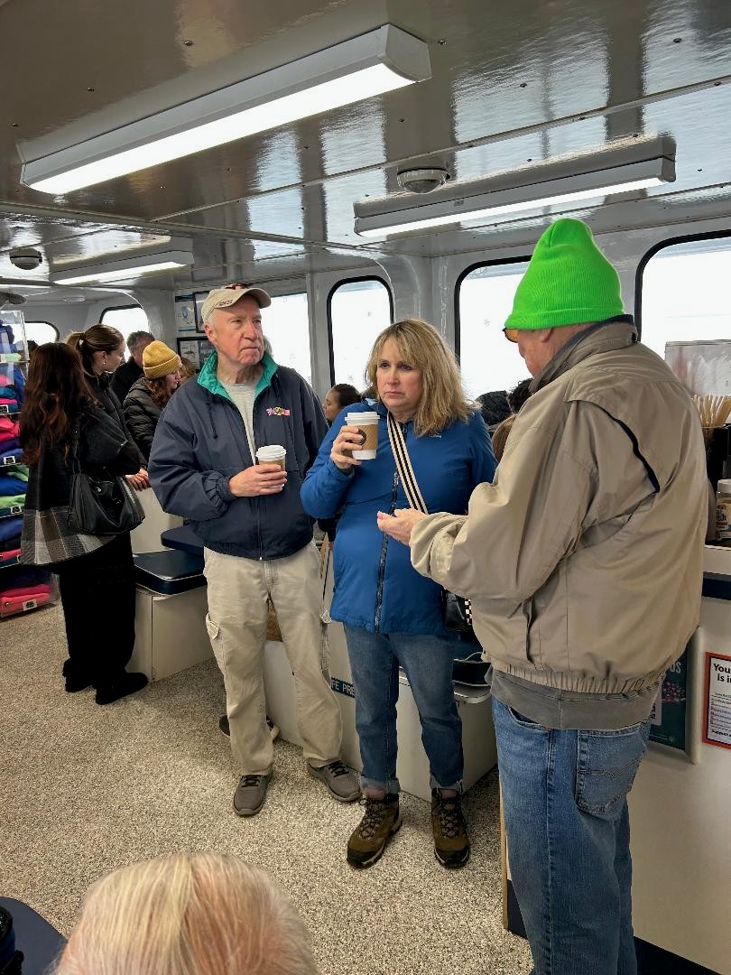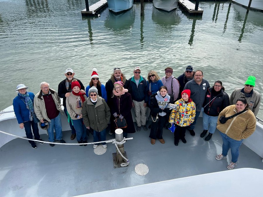 | February 21, 2025 - TRAACA Seal Watch Boat Trip - On Saturday February 21st, 18 bundled up club members and friends enjoyed our Whale-Watching trip that was postponed from its original date at the end of January because of a snowstorm We boarded the Rudee Flipper and departed right on schedule. A number of brave souls headed straight for the upper deck for the best views, while those who preferred warmth sheltered from the winds remained inside watching out the windows and visiting. Alas-the whales had moved on to warmer waters, leaving us to follow friendly Dolphins playfully leading the boat to the Chesapeake Bay Bridge tunnel. There we had the chance to watch some seals playing around the island’s rocks. Once the boat turned towards home again, the outside gang quickly retreated to the warmth below. Afterward, everyone meet at Victoria’s for some wonderful pizza, then went a few doors down to buy some personal-sized cheese-cakes from “Enjoy”, a small bakery offering cup-cake sized cheesecakes in an unbelievable variety of flavors. It was a great day out despite the cold. Attending were Harry and Tammy Park with their daughter Courtney and grandkids Aubrey and Dylan, Richard and Sandy Hall, Rick and Karol Seaman, Mike and Denise Haag, Chip Woolford and Julia Griffen, Terry & Susan Bond, and Linda Pellerin with her Aunt and Uncle, Mary and Carl McComas visiting from West Virginia. (Story by Terry Bond, photos by Susan Bond and Harry Park) |